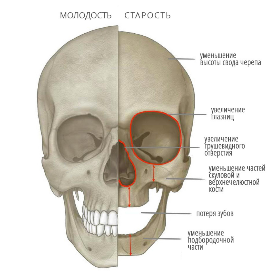В тех местах, где ушел объем костей "приходят" морщины, брыли, грыжи, мешки под глазами... чтобы хоть как-то заполнить пустоту!